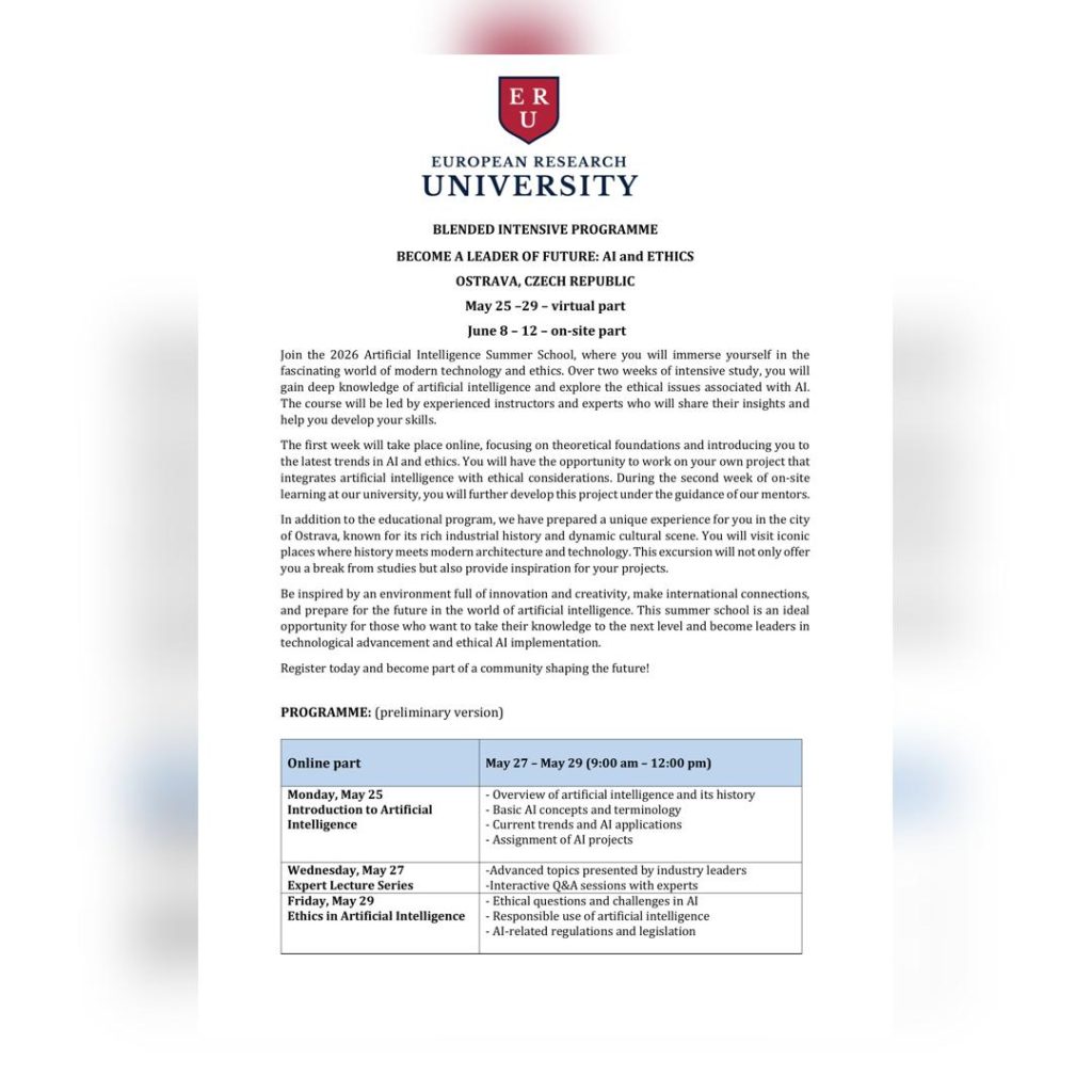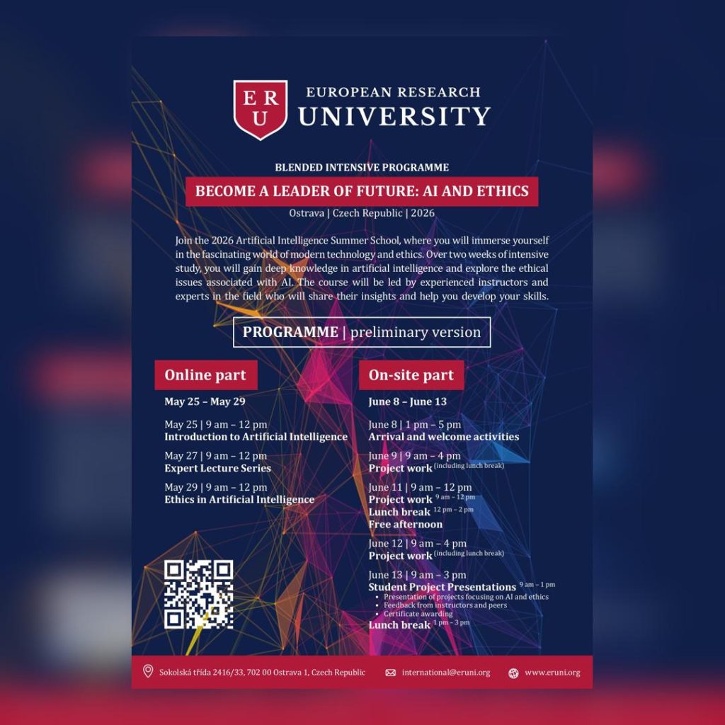 Vabimo vas k prijavi na mednarodno poletno šolo “Become a Leader of Future: AI and Ethics”, ki bo potekala v organizaciji European Research University v Ostravi.
